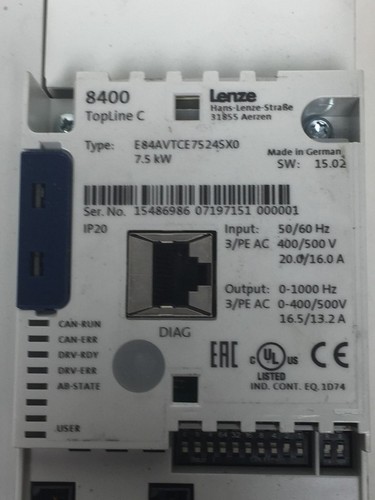 Input: 50/60Hz, 3/PE AC 400/500 V, 20,0/16,0 A Output: 0 - 1000 Hz, 3/PE AC 0 - 400/500 V, 16.5/13.2 A