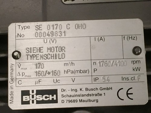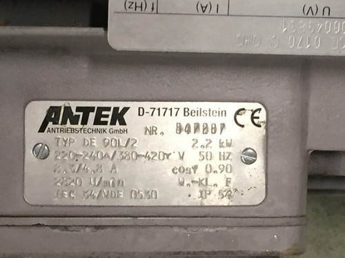 Vmax 170 m3/h, Pmax 160 hPA (mbar) 1760/4100 rpm Antek Motor DE 90L/2 220-240V/ 380 - 420 V 50Hz 2,2 Kw 3,3/4,8A 2820 U/min.