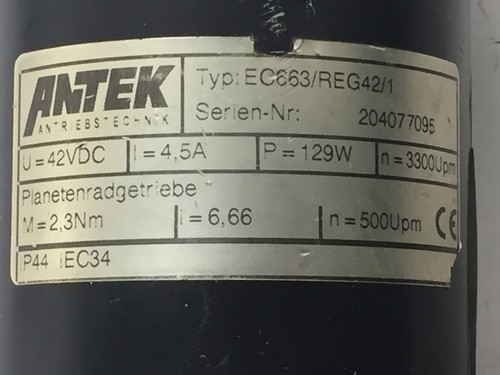 U = 42 VDC, I = 4,5 A, P = 129 W, n= 3300 UpmPlanetary Gear M = 2,3 Nm, i = 6,66 n = 500 Upm