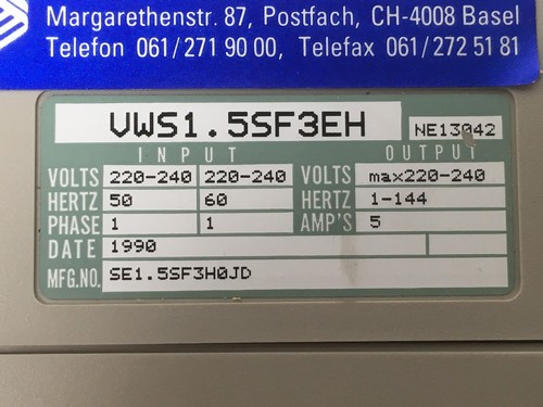 Input: 220 - 2540 V,50/60 Hz, 1 PhaseOutput: max. 220 - 240 V,1 - 144 Hz, 5 AKnown in the German Parts Manual as: Frequenumformer 5700140