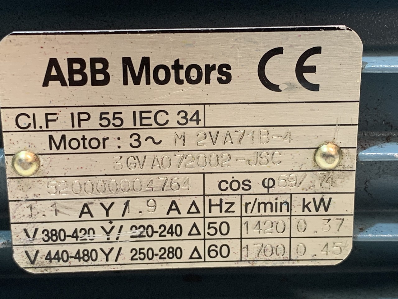440-480 V Y, 250-280 V, 60 Hz, 1700 r/min., 0,45 Kw