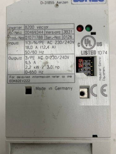 Output: 3/PE AC 0-230/240 V, 9,5 A 2,2 kW/3.0 hp, 0-650 Hz