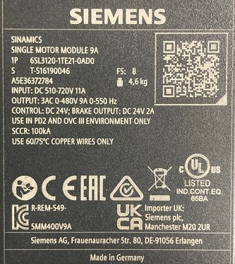 Input: DC 510 - 720 V, 11 AOutput: 3 AC 0 - 480 V, 9 A, 0 - 550 HzControl: DC 24 V; Brake Output: DC 24 V, 2 ASCCR: 100 kA