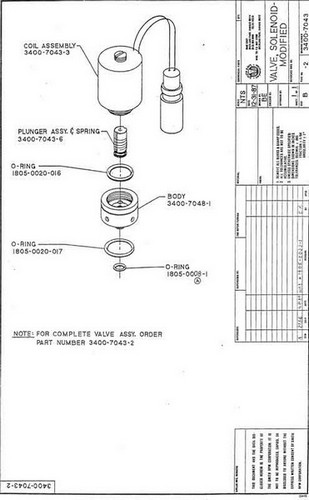 - Lot number 08/00 24 volts DC 7 watts This assembly consists of the following parts: Coil Assembly 3400 7043 3 Plunger assy sprin 3400 7043 6 O ring 1805 0020 016 Body 3400 7048 I O ring 1805 0020 017 O ring 1805 0008 I