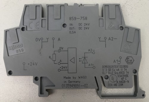 Wago optocoupler 859-758IN: DC 24VOUT: DC24V0,5AOrder-no:68213800 969 61 337413Draw.-no:L0849059 APos.-Info: STL-POS 06110245033001