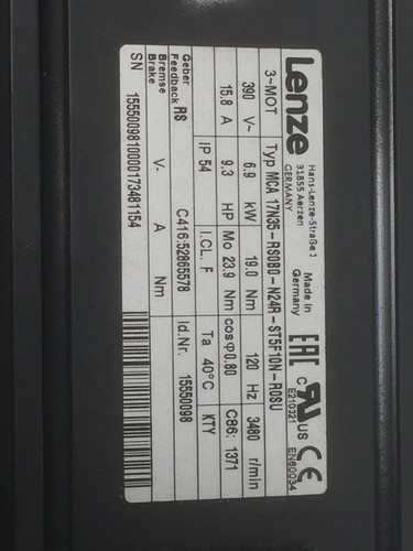 390 VAC, 6,9 kW 19,0 Nm 120 Hz 3480 r/min